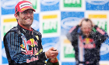 Australia's Mark Webber celebrates his second victory of the year at the Brazilian grand prix at Interlagos. Photograph: Vladimir Rys/Bongarts/Getty Images